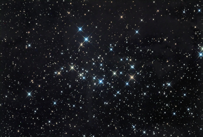 detached from the background sky and without a concentrated core. With an apparent diameter of 15 arc-minutes across, the cluster is dominated