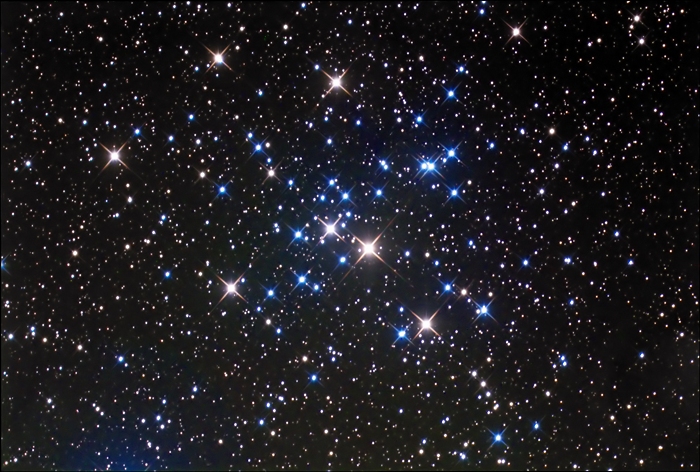 eye under dark skies. It is comprised of approximately 100 member stars including four prominent bright yellow-orange stars (mags 6.91 to