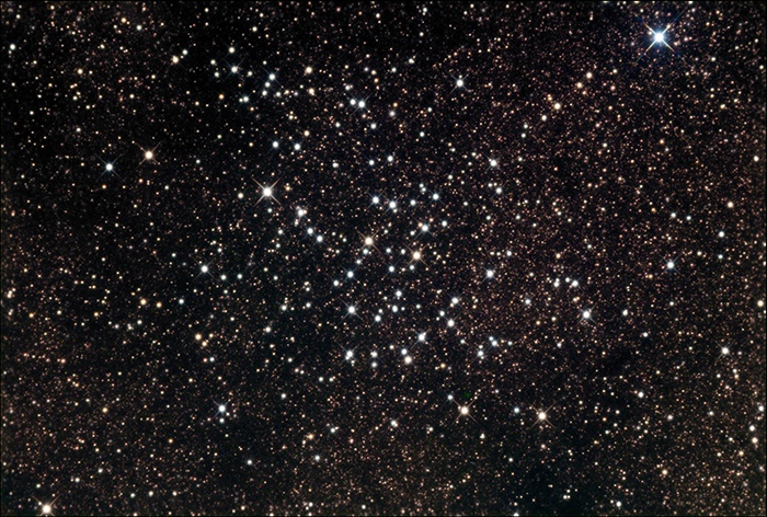 the predominance of white hot stars in the image below. The cluster is best observed using low magnifications (50-100x) during mid-summer