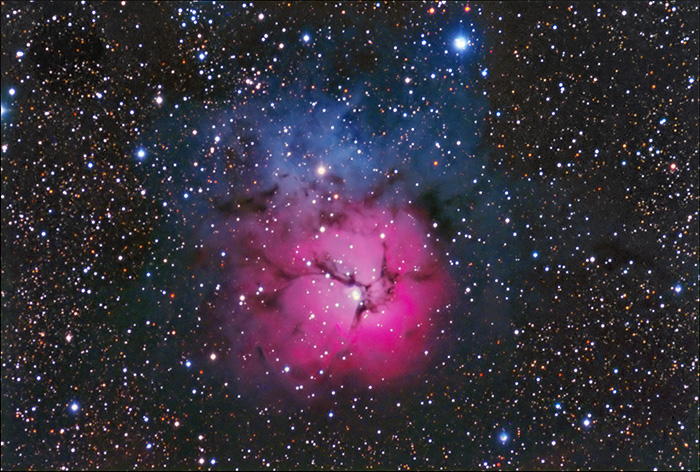 ranging in magnitude from 7.6 to 10.7. The Trifid Nebula lies 2,200-7,600 light-years away (depending on the source) with