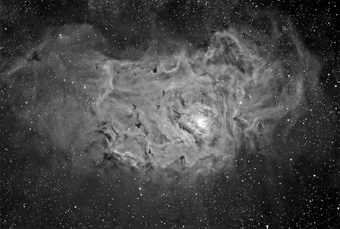 of an emission nebula. More commonly referred to as the Lagoon Nebula thanks to the dark curved lane which runs through