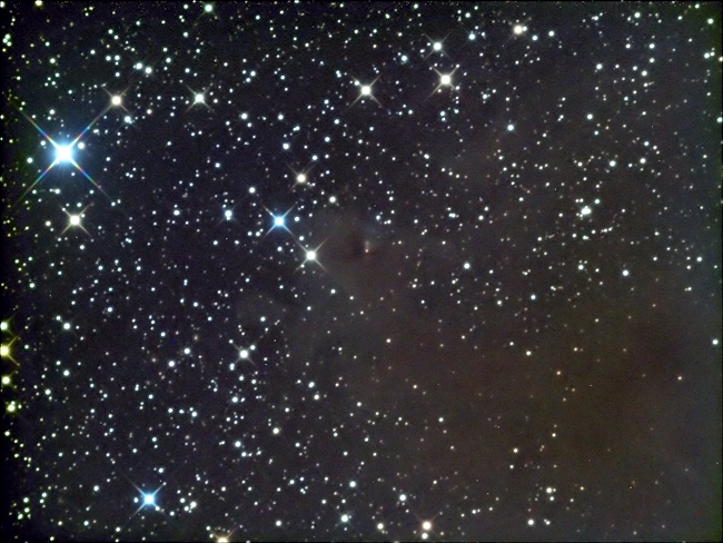 opposing direction is obstructed by a dark nebula. The nebulosity encases a handful of stars of magnitude 9.5 to 10.5 as