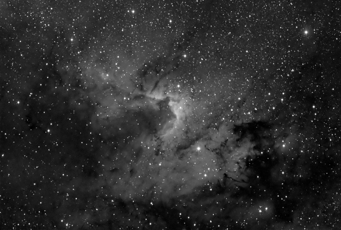 brighter than the southern half. Commonly referred to as the Cave Nebula owing to a circular formation near the center resembling a cave,