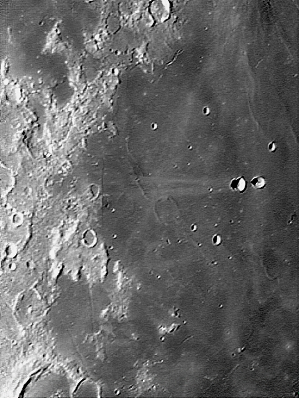 Named after the well-known French mathematician and comet hunter of the 18th century, Charles Messier, this pair of elongated craterlets measuring 11 and 13 km in length and 9 km in width on the western half of Mare Fecundidatis are a stunning pair for a variety of reasons. As indicated by the image below, a ray pattern to the west of both craters suggests an impact from east to west which occurred at a low and oblique angle. Furthermore, careful examination of the westernmost crater of this pair, Messier A, indicates the presence of a "lip" to its immediate west which is the remaining rim of an earlier crater which, for the most part, was obliterated by the latter impact leading to the formation of these new craters. Craters Messier and Messier A are relatively young and are believed to be 1.1 billion years of age or less. The ejecta material producing the ray to the west of Messier A is a stunning sight and readily visible with most magnifications.