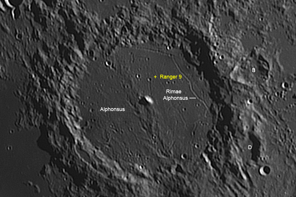 Crater Alphonsus is the middle crater in the impressive triplet sequence involving impact craters Ptolemeus, Alphonsus and Arzachel.