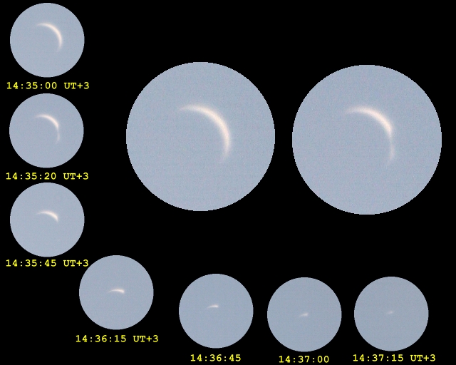 Date: May 21, 2004 14:35:00 - 14:37:15 UT+3 Location: Athens, Greece Equipment: Celestron 14" SCT Losmandy G-11 GEM Canon EOS 300d Baader IR-Cut Filter (1.25") Exposures: 7 x 1/3200 sec ISO 800 RAW Image Format 3072 x 2048 Image Size Manual Mode Software: Canon FileViewer V1.3.2 Photoshop V6 Processing: RAW to TIFF (16-bit) Conv Levels & Curves Masks & Layers Resampling JPG Compression |