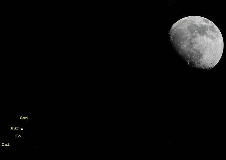 Due to the dramatic difference in magnitude between the Moon, Jupiter and the Jovian satellites, two separate exposures were