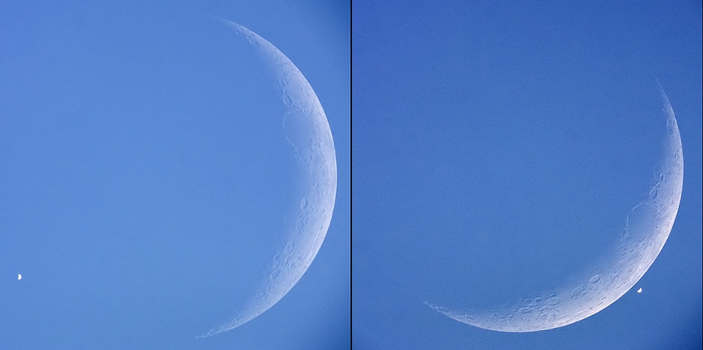 arc-seconds, a magnitude of -4.4 and a phase of 44.1% whereas the waxing 3.5-day old crescent moon was at magnitude -7.9