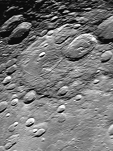 Named after the nineteenth century French solar astronomer Jules Janssen, this large crater whose diameter is nearly 200 km is perhaps best known for its 114 km long rille (Rima Janssen) which spans the western half of the crater and has the unique distinction of representing a rare example of a highland rille. As revealed by the image below, crater Janssen is characterized with low walls, a rough interior floor dominated by the above-named rille and the craterlets Janssen H, K and L north of center and the formations Janssen A and B to the east. Crater Fabricius is the large formation to the northeast whose wall is embedded with that of Janssen.