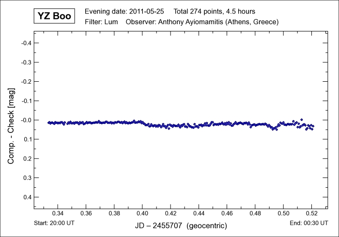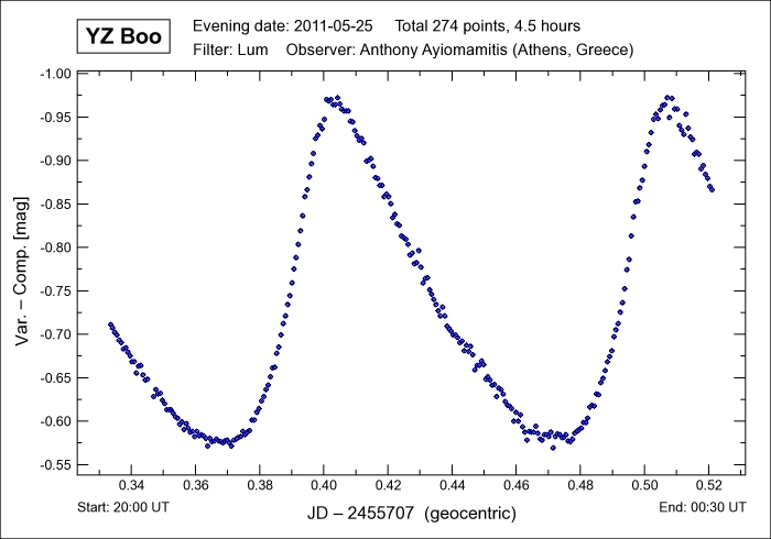 period of 149.89 minutes and which involves a delta mag of 0.50 (V) magnitudes during this brief time interval. The variability of YZ Boo was