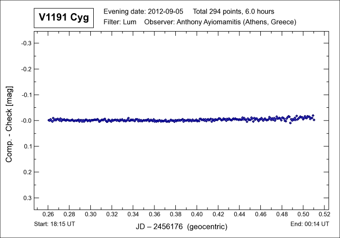 days and which involves a delta mag of 0.33 (v) magnitudes during this brief time interval. The variable nature of V1191 Cyg was discovered by