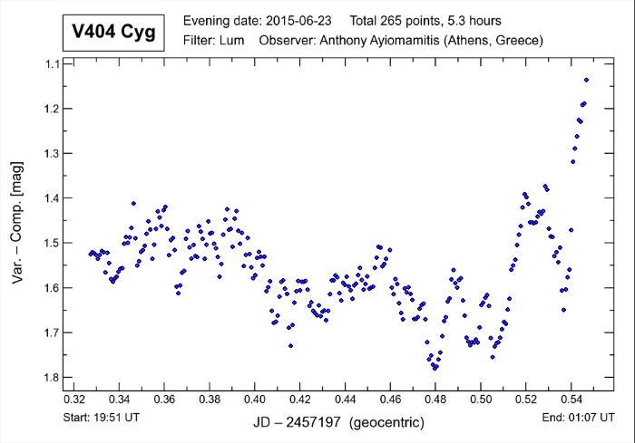 Variable Star: V404 Cyg Other Designation: GS 2023+338 RA / Dec: 20h 24m 04s / +33° 52' 02" Magnitude: 11.5 - 18.48 (p) Period: 6.64714 days Variability: LMXB/XN Comparison Star: GSC 2693:1051 Check Star: GSC 2693:1473 |