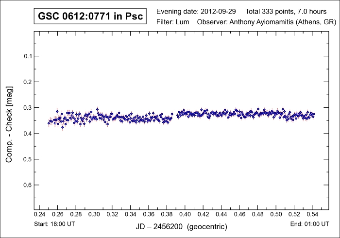 Variable Star: GSC 0612-0771 Other Designation: ASAS 010618+0846.2 RA / Dec: 01h 06m 18s / +08° 46' 12" Magnitude: 11.07 - 11.38 (v) Period: 0.062784 days Variability: DSCT Comparison Star: GSC 0612:0975 Check Star: GSC 0612:0675 Moon: 14-day (very nearby) |