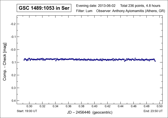 Software: CCDSoft V5.00.201 AIP4Win V2.4.0 Processing: Reduction Differential Photometry |