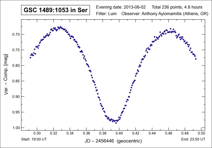 days and which involves a delta mag of 0.338 (R) magnitudes during this brief time interval. The variable nature of GSC 1489-1053 was first