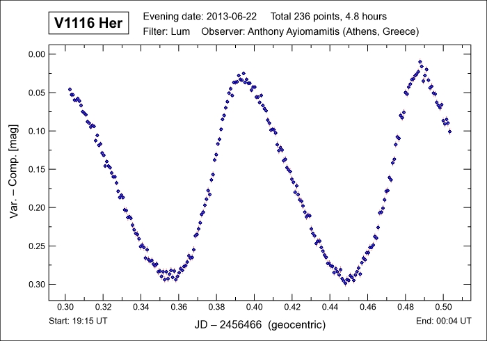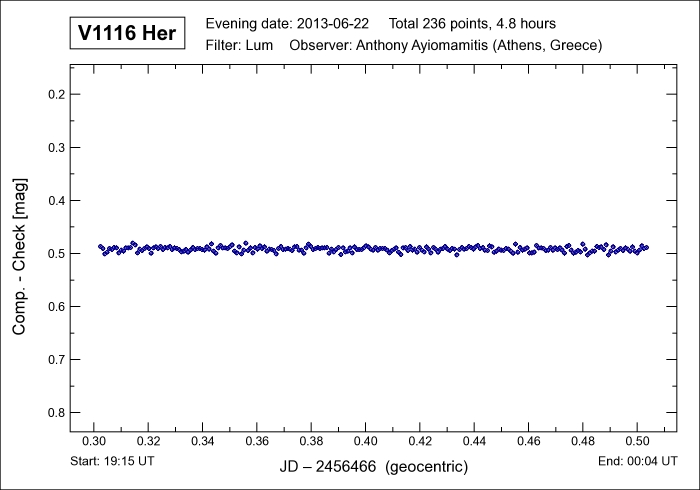 period of 136.34 minutes and which involves a delta mag of 0.29 (v) magnitudes during this brief time interval. V1116 Her is a delta Scuti-type