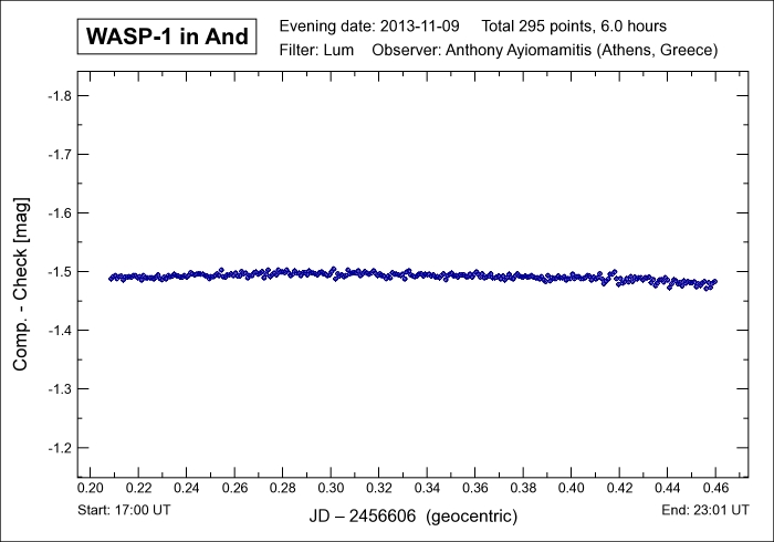 Parent Star: WASP-1 GSC/SAO Catalog: GSC 2265:0107 Constellation: Pegasus RA / Dec: 00h 20m 40.1s / +31° 59' 23.7" Magnitude: 11.79 Distance: 1,234 light-years Exoplanet: WASP-1b Period: 2.51995 + 0.00001 d Transit Duration: 224.4 mins Transit Depth: 13 mmag Minimum Mass: 0.85 MJup Radius: 1.39 RJup Pred Transit Details: