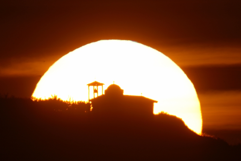 A dramatic setting sun against the Church of Agios Sotirios was captured a few weeks earlier from a distance of 2505 meters away in the same