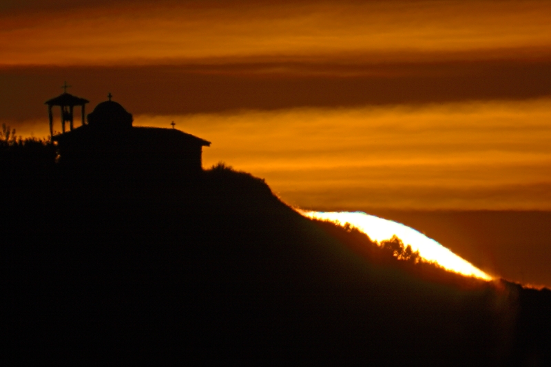 A dramatic setting sun against the Church of Agios Sotirios was captured a few weeks earlier from a distance of 2505 meters away in the same