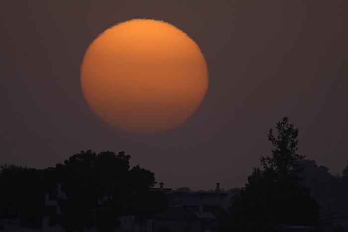 since volcanic ash can lead to very dramatic sunsets. The image below was taken a few kilometers from the seaside resort area of Oropos northeast