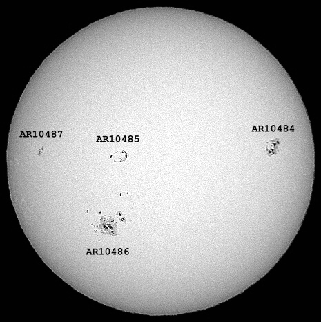 Note: The sunspot groups AR10484 (Zurich class: Ekc, 03° N, 41° W) and AR10486 (Zurich class: