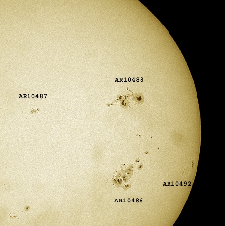 Note: The sunspot groups AR10486 (Zurich class: Fkc, 18° S, 18° W) and AR10488 (Zurich class: