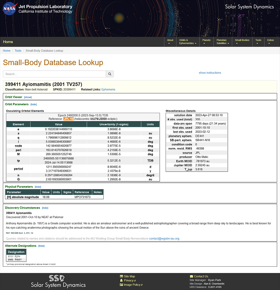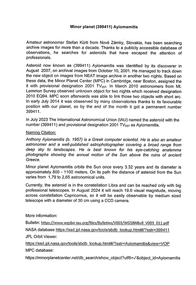 in honour of my work in astrophotography. The asteroid, 399411 Ayiomamitis, was discovered on Oct 10, 2001 by Slovakian astronomer Stefan Skurti