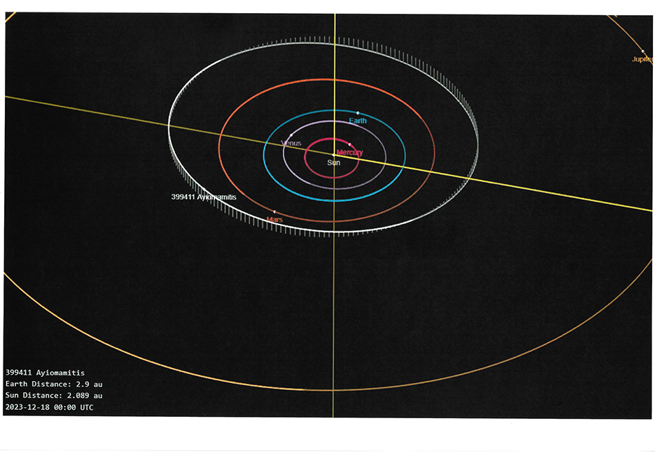 having established that 399411 Ayiomamitis has a fairly circular orbit (eccentricity = 0.1922), a diameter of 800 to 1100 meters across, a period