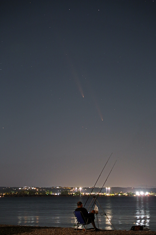 much larger white tail due to dust particle emission. Similarly, the anti-tail which is visible in images taken under much darker skies is