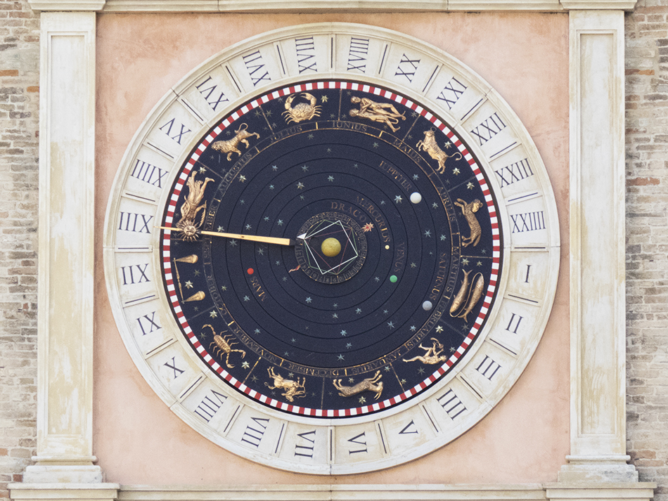 model of the Solar System persisted at the time and whioh explains the presence of the Earth at the center of the clock with five surrounding and labelled