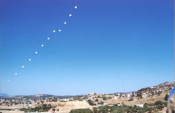 My OSCAR award for the mother of all blunders! Although the imaging of the analemma may be one of the most demanding and difficult astrophotography projects one may undertake, the calamity to the left should not have occurred at all and was painfully identified at the completion of the twelve-month imaging session! The objective of the exercise was to image the motion of the sun across the sky over a period of twelve months on the same piece of film. In order to trick my Canon AE-1 to emulate multi-exposure mode and, thus, fulfill the requirements of the challenge, I pressed the film rewind button at the baseplate of the camera while simultaneously advancing the film lever. Rather than me tricking the camera, it was the &(@$#^!* camera tricking me and to do so for a complete year with very slight movement of the film within the chamber. For proper analemma photos using cameras with proper multi-exposure capability, please click here ... and, yes, all of the failed analemmas were (painfully) restarted with proper camera gear in Jan/2003. | |