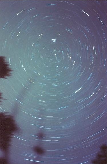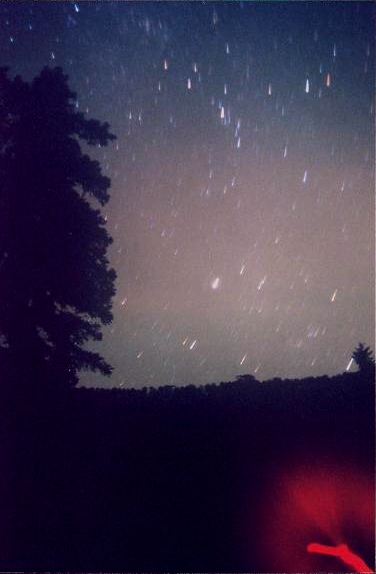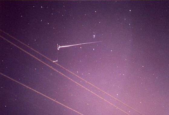 Now for a double blunder with yet another flare (Iridium 55). When the time came to trip the shutter, nothing happened. I checked the film advance lever but the film had already been advanced. I then checked the camera lock and there lied my problem. By unlocking the camera, the shutter tripped immediately (first blunder) since I had pressed it a few seconds earlier. Having forgotten that I had the "B" setting for the extended exposure already on and the flare was being recorded, I attempted to advance the film (second blunder). Late shutter release + camera motion = Hall of Shame honors! Fortunately, it would take only three days to successfully capture Iridium 55 at a similar magnitude. For a proper Iridium flare photo, click here and here. | |