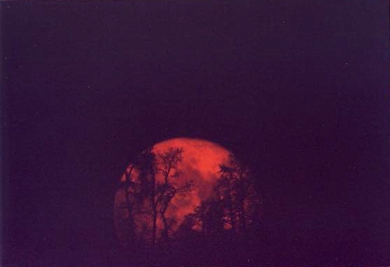 The very detailed and thorough analysis of the rising moon over three months was about to reach climax when I set up my camera for capturing the moon rising against some trees in the distant foreground which had burned down about twelve months earlier and whose bare skeleton had remained, thus making for a very unique and interesting photo at the prime focus of my 14" SCT. Of course, detailed calculations were performed for the proper exposure which, of course, was not only not even close but I also made the cardinal sin of failing to bracket by a few stops on either side of the computed "optimal" exposure. Yes, I may have saved a few inches of film emulsion by foolishly thinking I would nail the rising moon with a single photo but I am still waiting for the same opportunity and have been doing so for eighteen months ... and counting ... and still counting?! The poor composition, of course, made for a further mess. | |