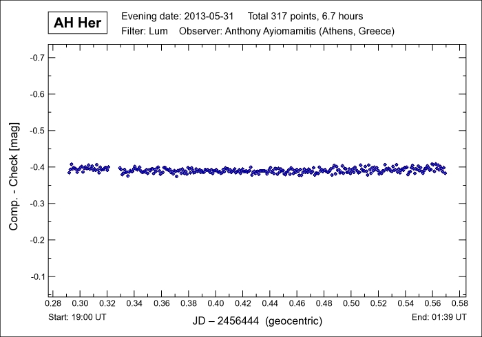 magnitude 14.7 at minimum. AH Her is characterized as a Z Cam-type variable due to its cyclical outbursts which cycle every 19.8 days. AH Her