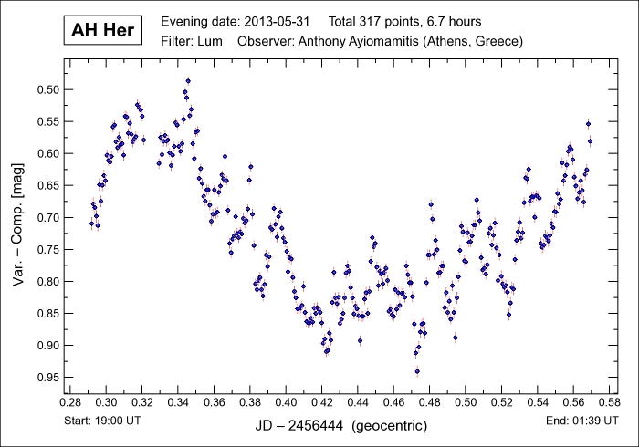 Note: The cataclysmic variable star AH Her has a period of 0.258116 days and which involves a delta mag